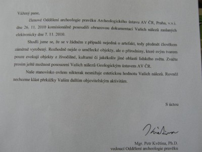 Zde bych chtěl představit listinu,která stvrzuje,že se v žádném případě nemůže jednat o artefakty,tady předměty,vyrobené,nebo upravené člověkem.Velice si cením těchto odborníků a jejich nesmírné geniality.Moc,opravdu moc mne mrzí že já neználek jsem tak jednoduchý a nepoznal jsem to.Čížek.